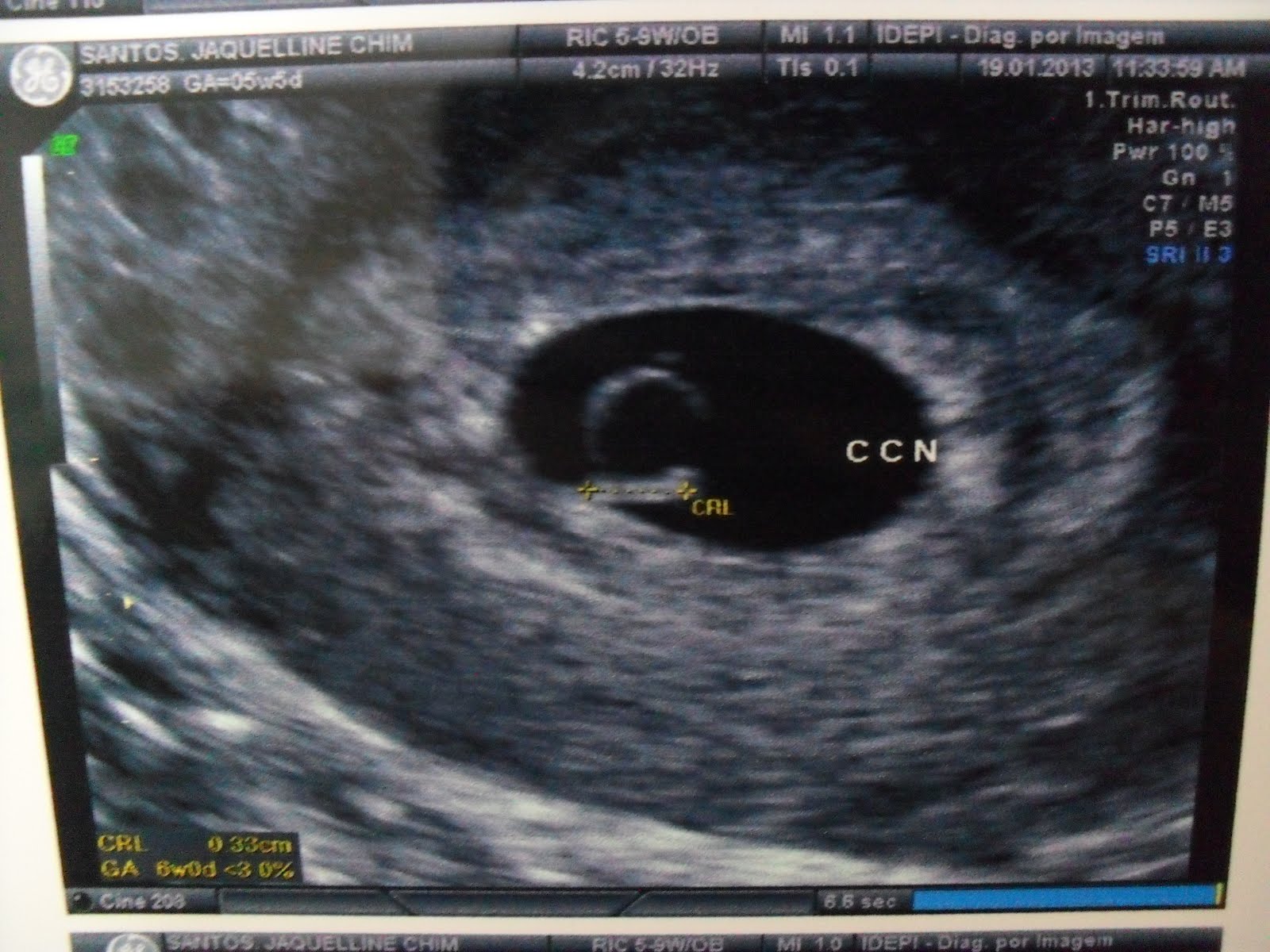 Felizmente a atendente era boazinha e conseguiu trocar a guia com facilidade, e logo entramos. Me troquei e toda aquela ladaiinha e fomos ver nossa alegria! Primeiro mostrou o saco gestacional, disse que ovulei do lado esquerdo (juuro que eu já sabia gente, é serio!era desse lado que doía!!) mostra todas as paredinhas, sem descolamento, sem hematomas, sem nada pra me preocupar. Mostra o saco gestacional (17mm, enoooorme! Sério, é muito grande pro espacinho que o bebê ocupa, haha!) e daí eu vejo, aquela coisinha minuscula, piscando!!Sim, eume assustei, achei que não teria coraçãozinho piscando ainda, achei que nem daria pra ver o baby, só o saquinho e a vesicula lá, mas não, tinha uma coisinha piscando!! O doutor era muito querido, começou a falar que ele tinha 3,3mm, que era literalmente um pinguinho de gente! Aí ele falou pra gente tentar ouvir o coraçãozinho, tava muuuito muuuito baixinho, disse pra gente não se preocupar porque esse período é quando os batimentos são mais baixos e devagares da gestação toda, que com umas 9 semanas é o auge e que vai aumentar muuito! No laudo nem consta quantos bpm's foram, vamos ter que esperar!